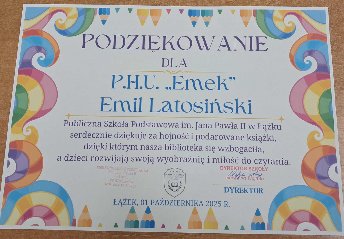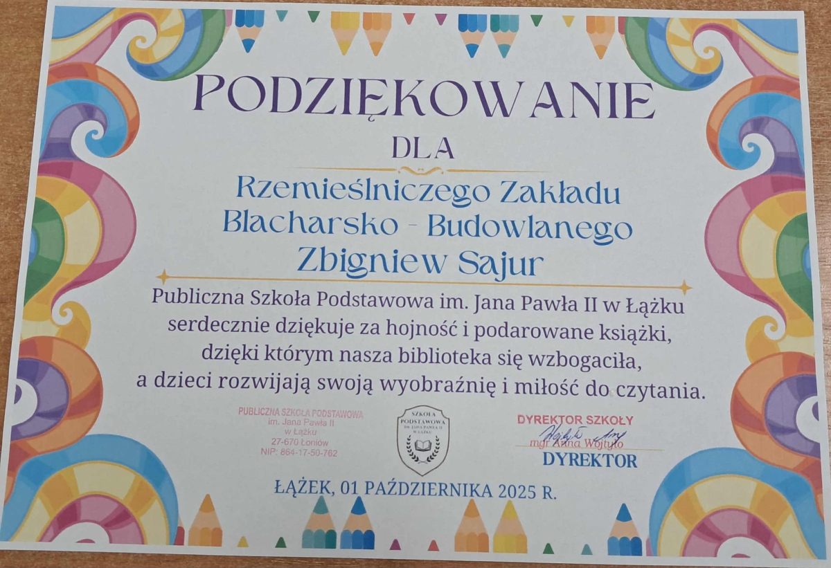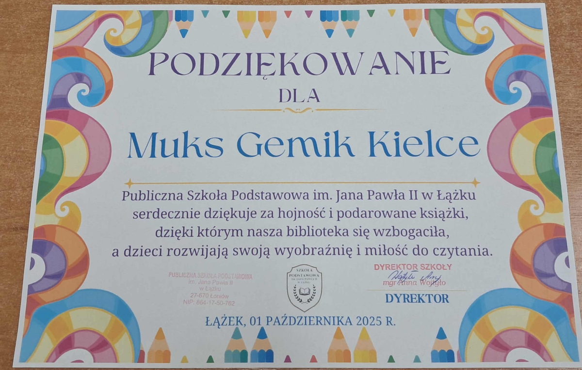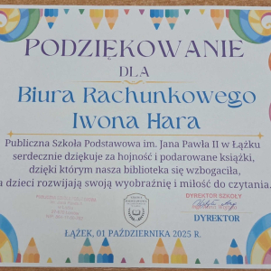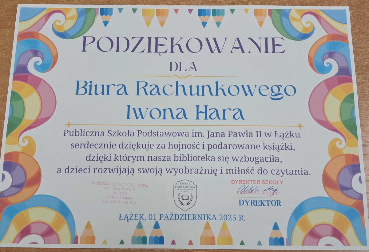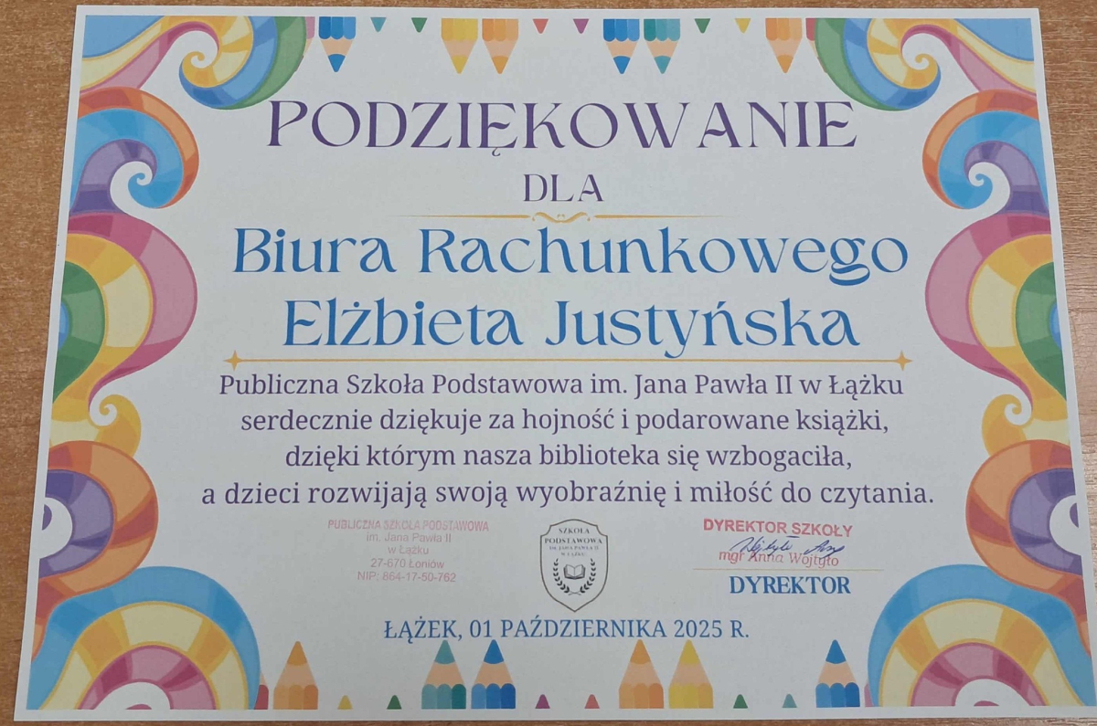 Dyrektor Szkoły, Wychowawca i Uczennice kl. I składają serdeczne podziękowanie Wydawnictwu Omnibus oraz Sponsorom: Biuro Rachunkowe Iwona Hara, Musk Gemik Kielce, Wb Stal Sylwester Dunicz, Biuro Rachunkowe Elżbieta Justyńska, Mieczysław Cyzio, Gabinet Fizjoterapii Mirosław Bakalarz, P.H.U. - Emek Emil Latosiński, Rzemieślniczy Zakład Blacharsko - Budowlany Zbigniew Sajur, Zakład Budowlany Damian Poros - za zaangażowanie i wielkie serce w przekazaniu książek, które wzbogaciły nasz kącik czytelniczy. Ten miły gest pozostanie na długo w naszej pamięci, a podarowane książki przyczynią się do pomnażania radości, jaką daje czytanie.