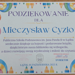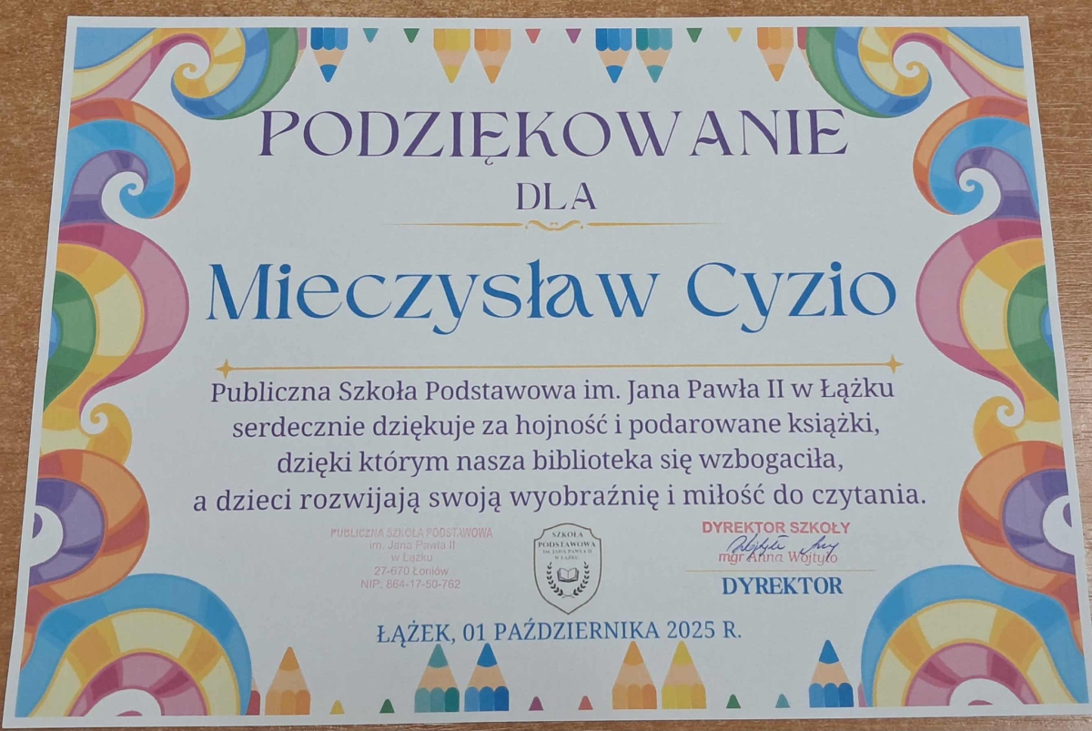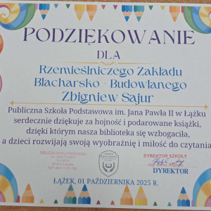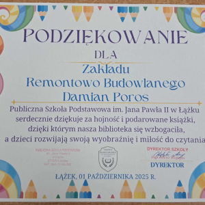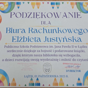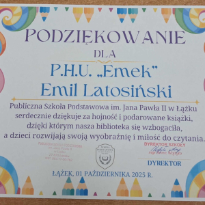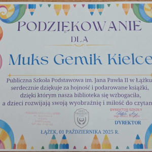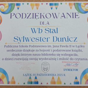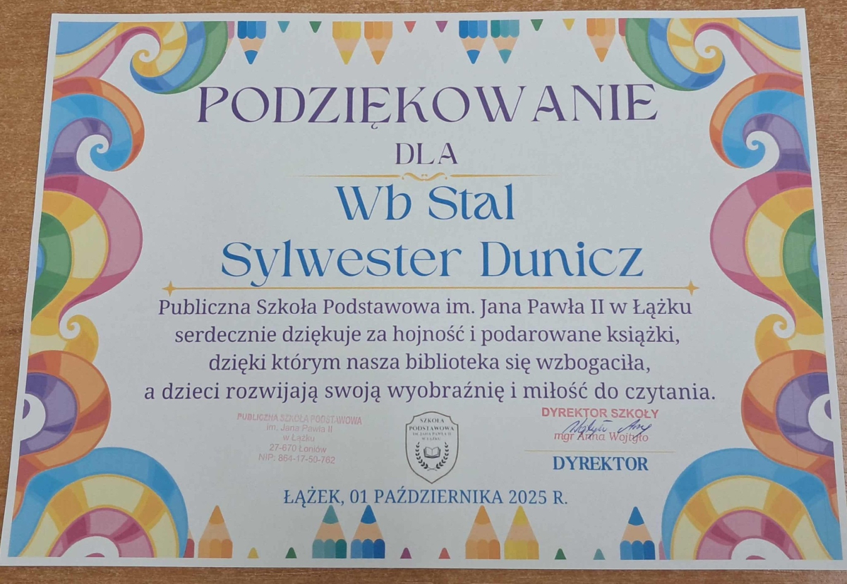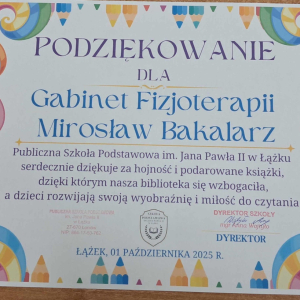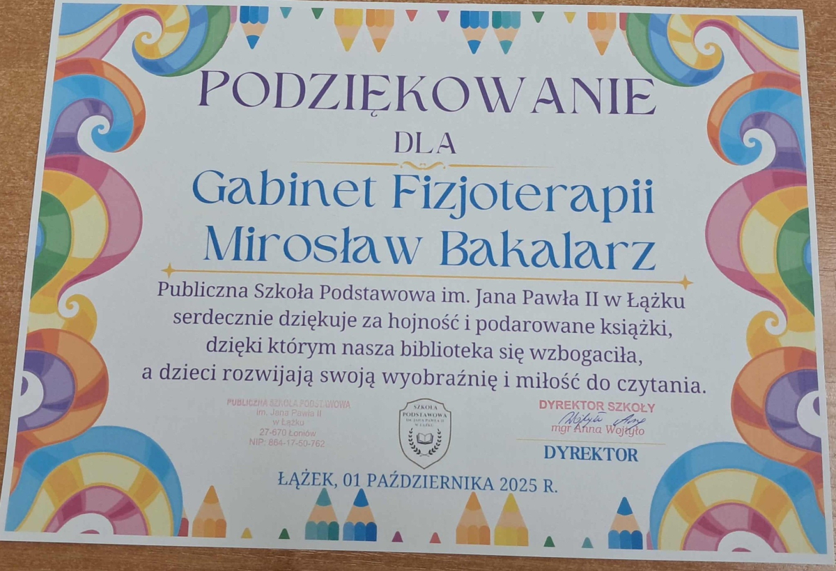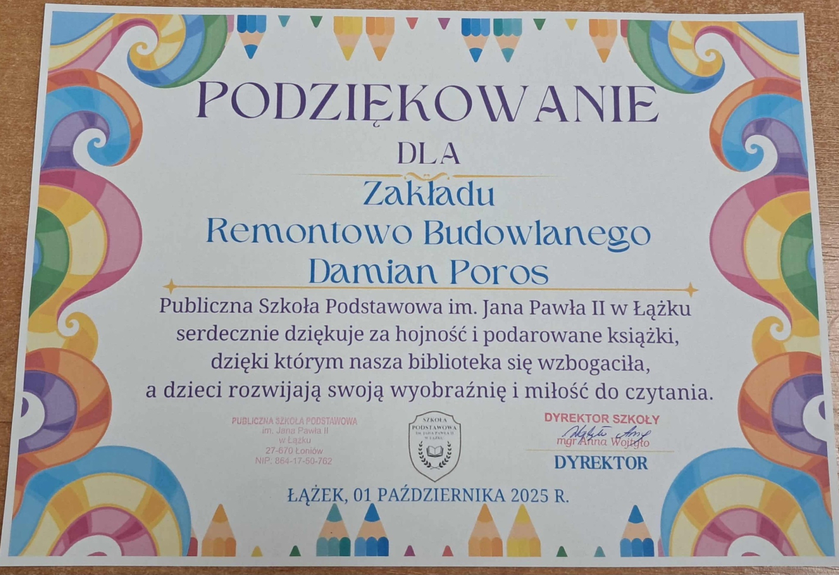 Dyrektor Szkoły, Wychowawca i Uczennice kl. I składają serdeczne podziękowanie Wydawnictwu Omnibus oraz Sponsorom: Biuro Rachunkowe Iwona Hara, Musk Gemik Kielce, Wb Stal Sylwester Dunicz, Biuro Rachunkowe Elżbieta Justyńska, Mieczysław Cyzio, Gabinet Fizjoterapii Mirosław Bakalarz, P.H.U. - Emek Emil Latosiński, Rzemieślniczy Zakład Blacharsko - Budowlany Zbigniew Sajur, Zakład Budowlany Damian Poros - za zaangażowanie i wielkie serce w przekazaniu książek, które wzbogaciły nasz kącik czytelniczy. Ten miły gest pozostanie na długo w naszej pamięci, a podarowane książki przyczynią się do pomnażania radości, jaką daje czytanie.