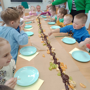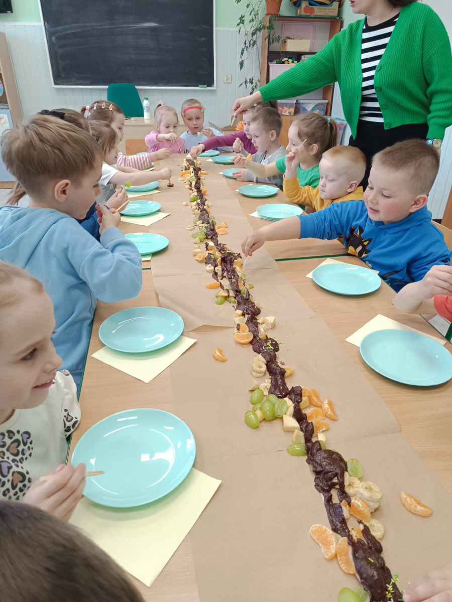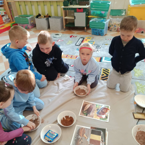 Dzieci wzięły udział w czekoladowych warsztatach sensorycznych ( wąchanie, dotykanie, smakowanie) i stworzyły piękne prace plastyczne. Na koniec była pyszna degustacja : owoce i gorąca czekolada.