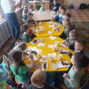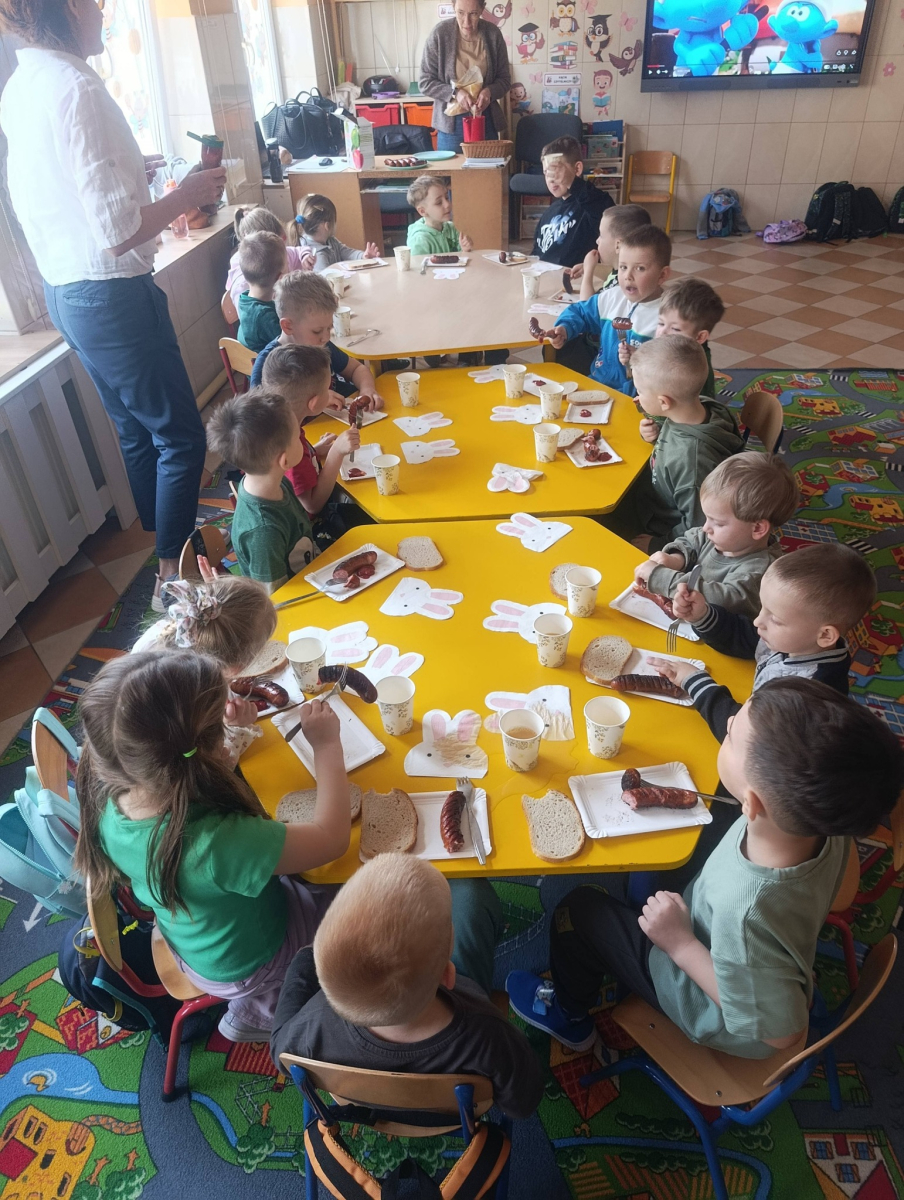Na zakończenie dnia czekała na wszystkich pyszna niespodzianka — kiełbaska z grilla, która smakowała wyjątkowo po aktywnie spędzonym czasie na świeżym powietrzu .