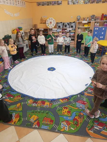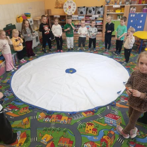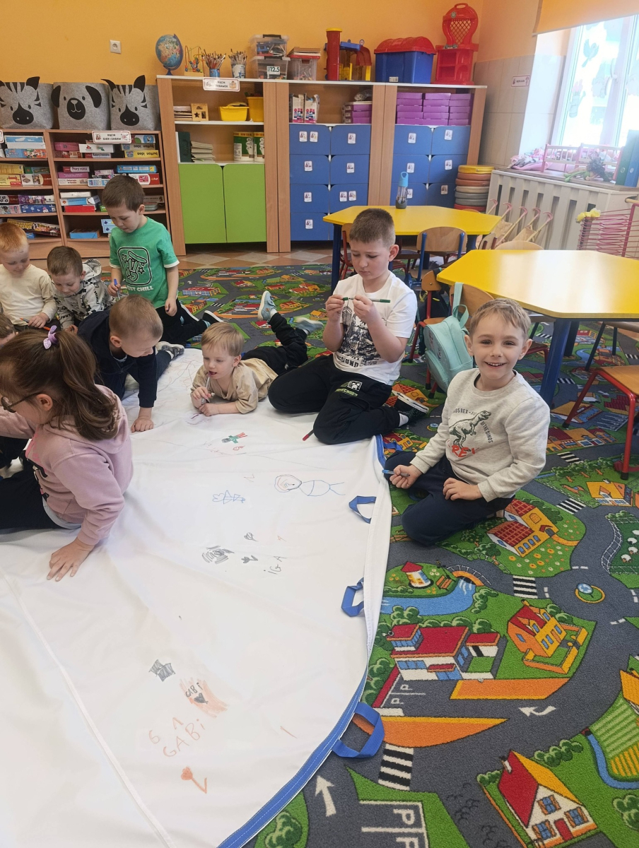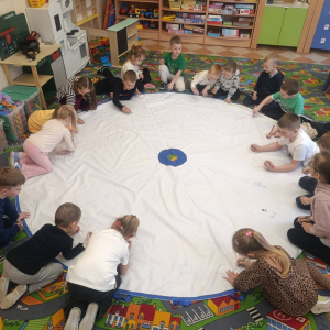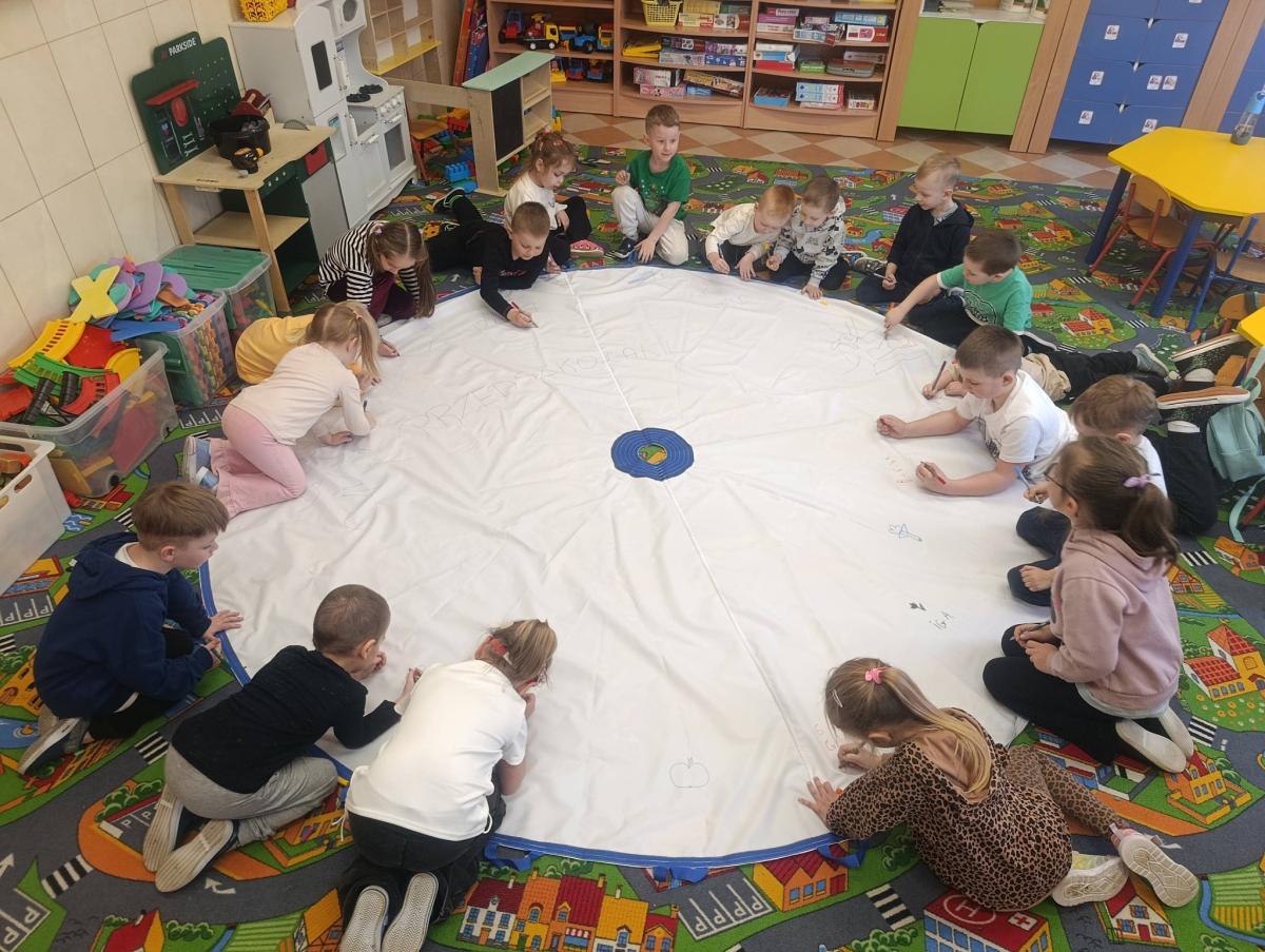 Dziś dzieci malowały na specjalnej chuście animacyjnej do malowania. Było mnóstwo kolorów, radości i kreatywnej zabawy — ogrom frajdy dla wszystkich małych artystów!