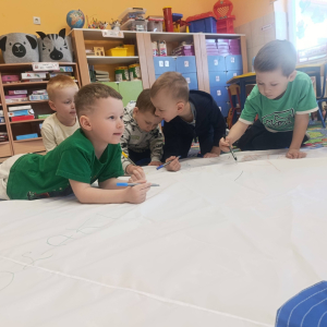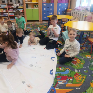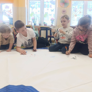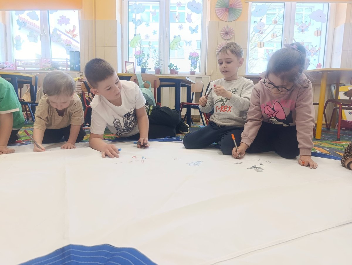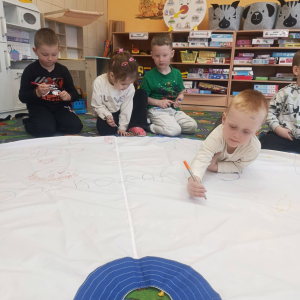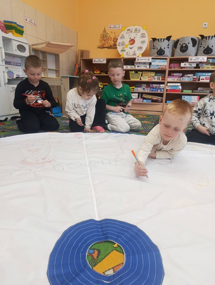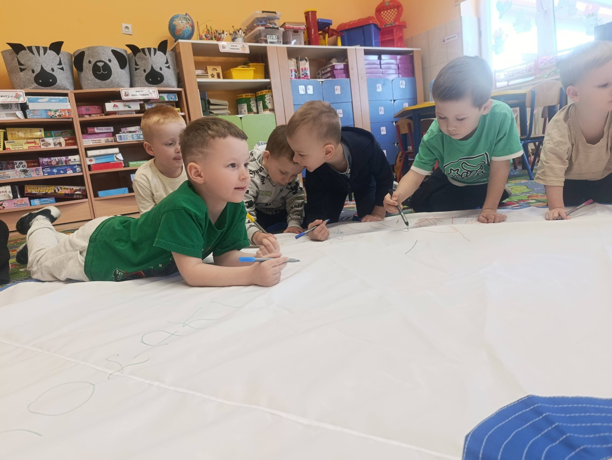 Dziś dzieci malowały na specjalnej chuście animacyjnej do malowania. Było mnóstwo kolorów, radości i kreatywnej zabawy — ogrom frajdy dla wszystkich małych artystów!