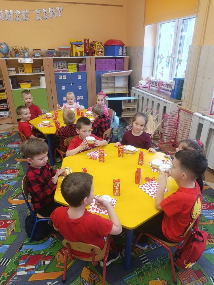 Dziś w naszym przedszkolu było wyjątkowo słodko i radośnie. Połączyliśmy świętowanie Walentynek z Tłustym Czwartkiem. Dzieci wspólnie wykonały walentynkę, wkładając w nią dużo serca i kreatywności. Na zakończenie na wszystkich czekał pyszny poczęstunek w postaci pączków.