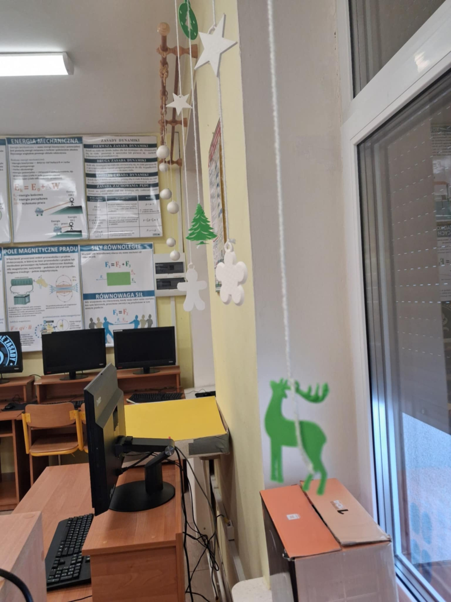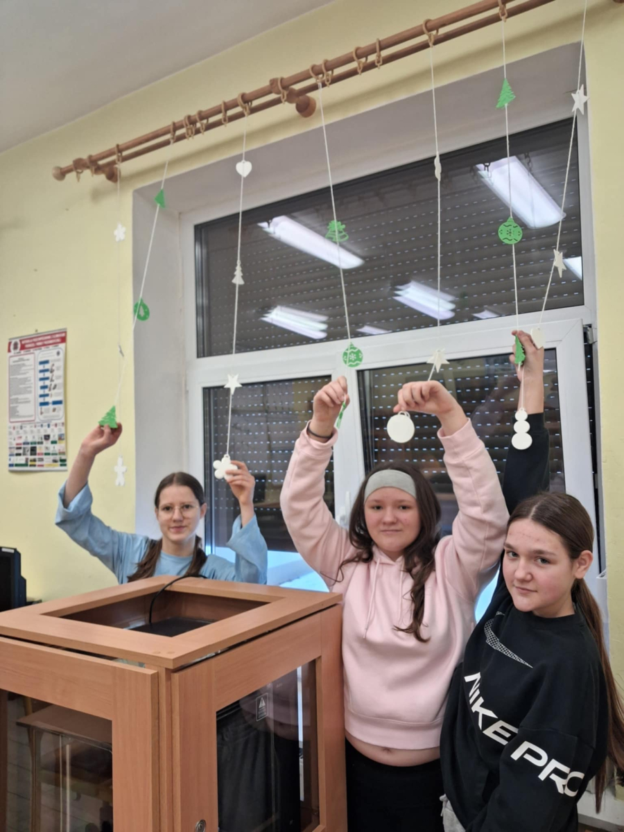 W zajęciach rozwijających uczestniczyli także uczniowie klasy VII, którzy również pracowali z projektowaniem 3D. W ramach zajęć tworzyli ozdoby świąteczne, które obecnie zdobią klasę informatyczną. Uczniowie z dużym zaangażowaniem realizowali swoje pomysły, łącząc umiejętności techniczne z kreatywnością i poczuciem estetyki.